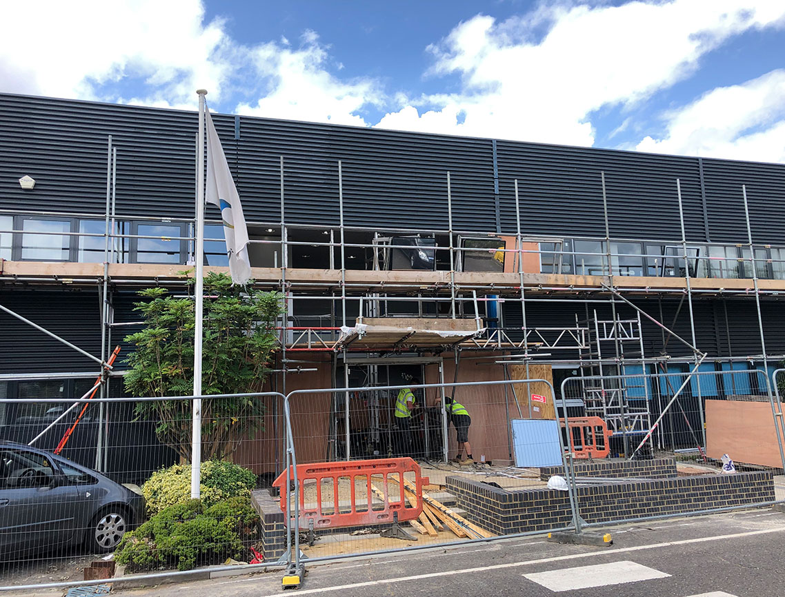 Externally, we completed a full renovation of the building façade. This included decoration of the metal clad curtain wall system, replacement of all windows and doors, and installation of a new main entrance with a striking canopy. Landscaping works were also undertaken around the front entrance to improve aesthetics and allow for the provision of a compliant DDA ramp.